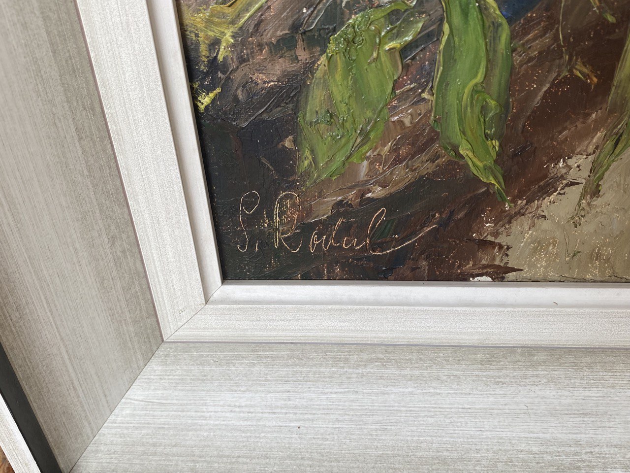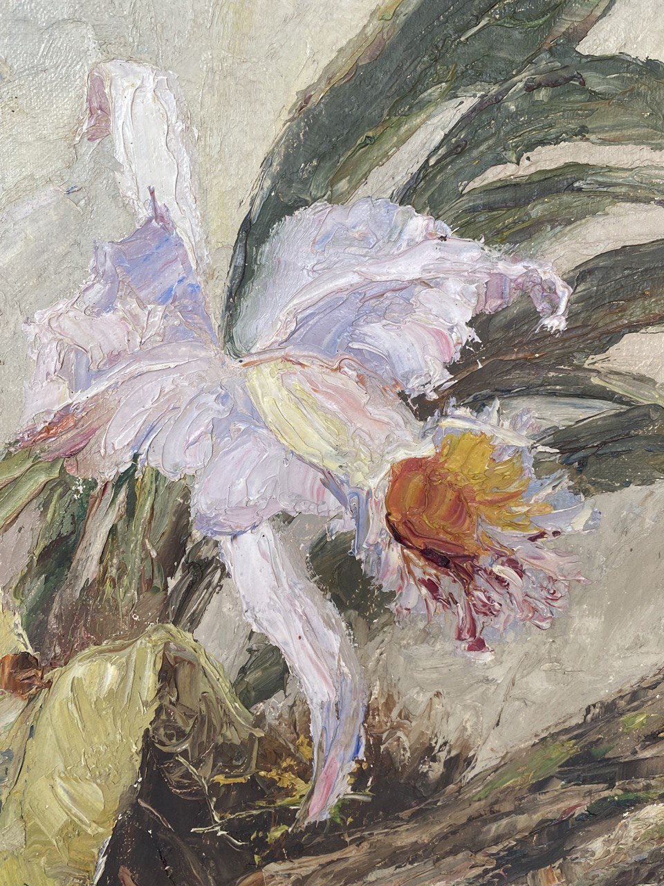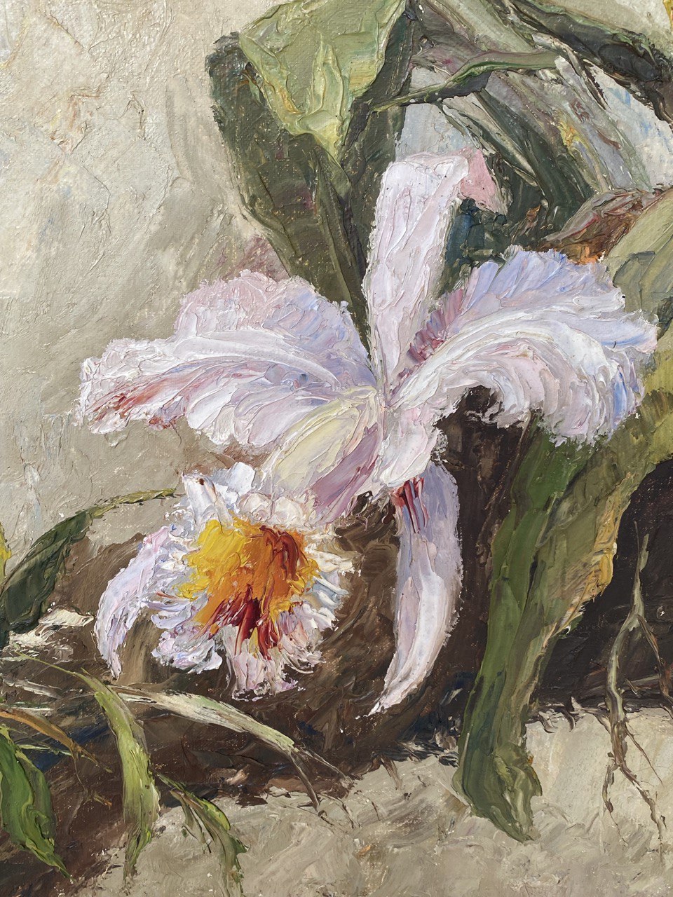 Großes Gemälde, Öl auf Leinwand, Motiv „Orchideen auf Baum wachsend“, unbekannte Signatur, Malstil Neo-Impressionismus, im Originalrahmen, Maße ohne Rahmen: 55 x 65 cm, Maße mit Rahmen: 80 x 70 cm, 1950er Jahre